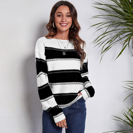 Women's casual sweater with modern lace pattern and stripe design Ivyshape
