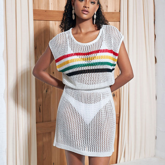 Women’s Mesh Beach Dress with Colorful Stripe Pattern and Casual Cut Ivyshape