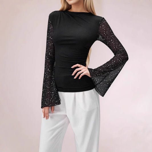Women Elegant Top with Decorative Lace Sleeves and Gathered Detail Ivyshape