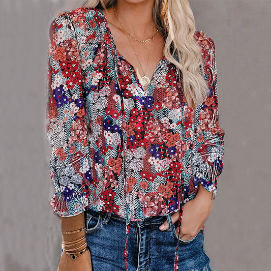 Women elegant tie blouse with ruffle details and deep V-neck Ivyshape