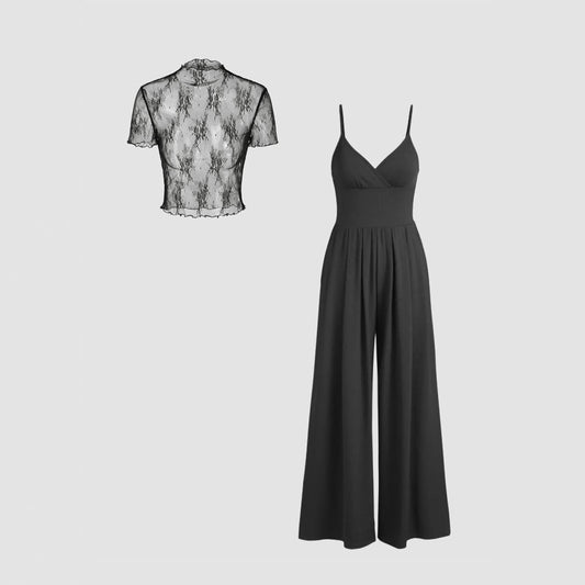 Women elegant V-neck jumpsuit with transparent blouse Ivyshape