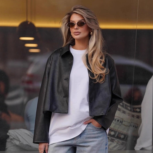 Women Fashionable cropped Faux Leather Jacket with Stylish Details Ivyshape