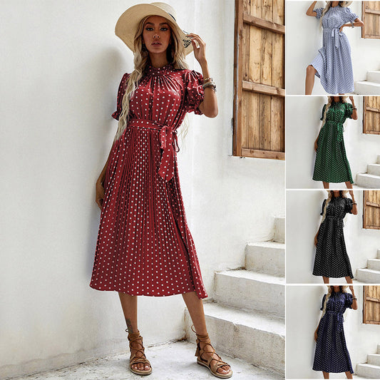 Women's pleated dress with a tailored belt and elegant puff sleeves Ivyshape