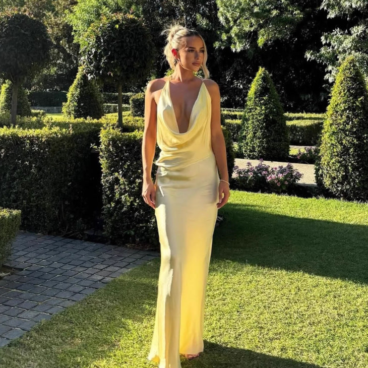 Women Elegant Satin Maxi Dress with Deep Wrap Neckline Ivyshape