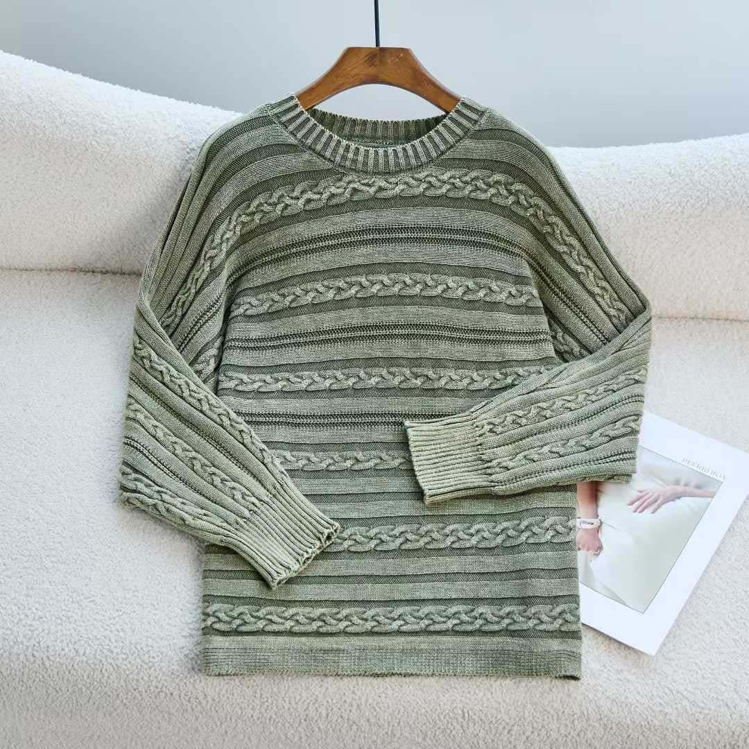 The sweater features a unique textured pattern that creates a modern look with the combination of wide stripes and a cable knit design. The loose fit provides a relaxed silhouette, while the long sleeves and round neckline offer additional comfort.