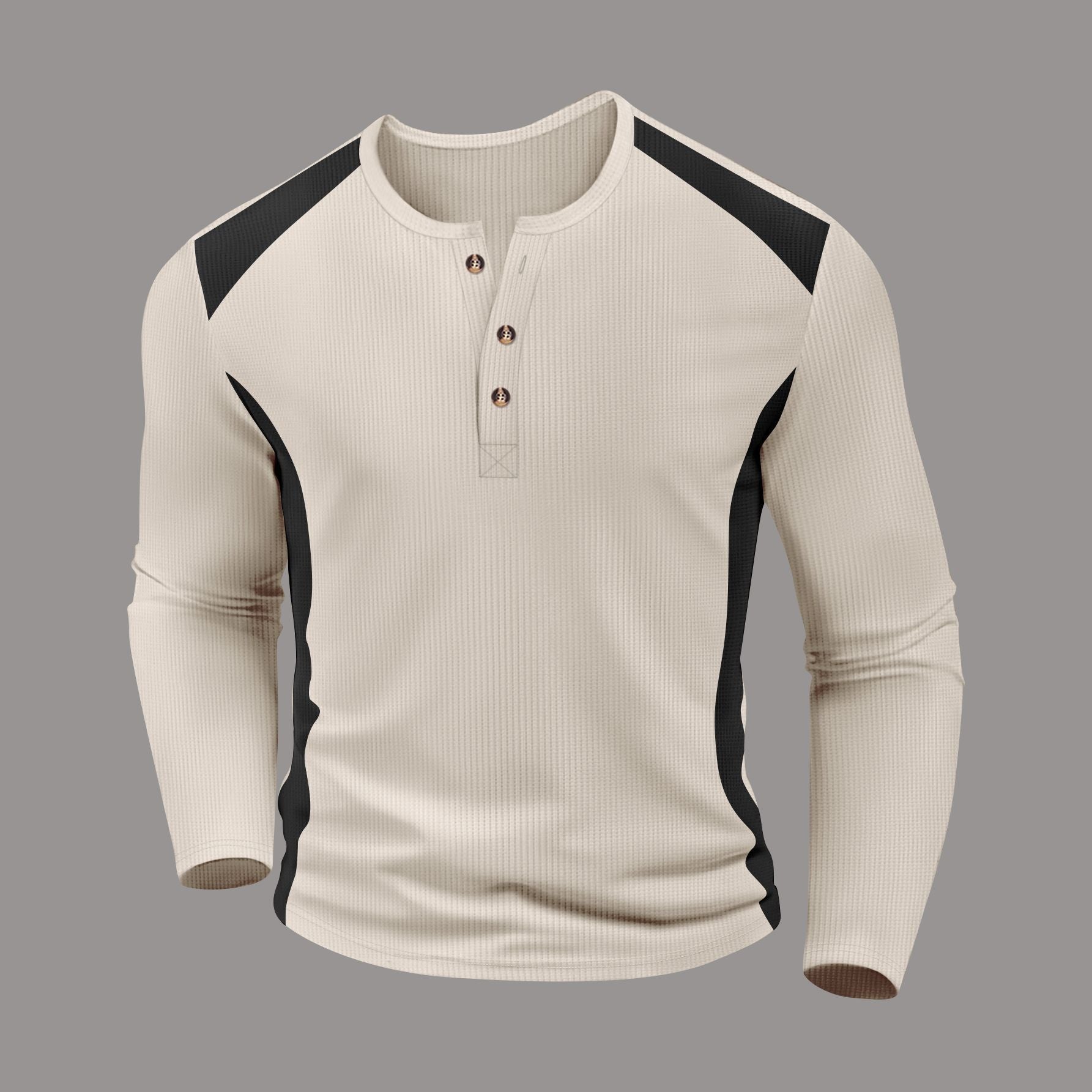 Fashionable Henley Design: The characteristic buttons give the shirt a sporty and casual look.