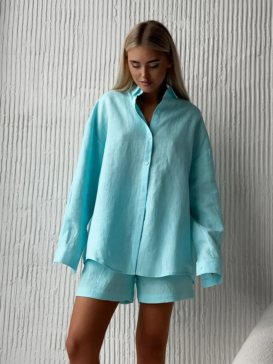Discover our stylish women's casual linen set, which consists of a generously cut blouse and comfortable shorts. Ideal for relaxed summer days or leisurely outings, this outfit offers both comfort and elegance.