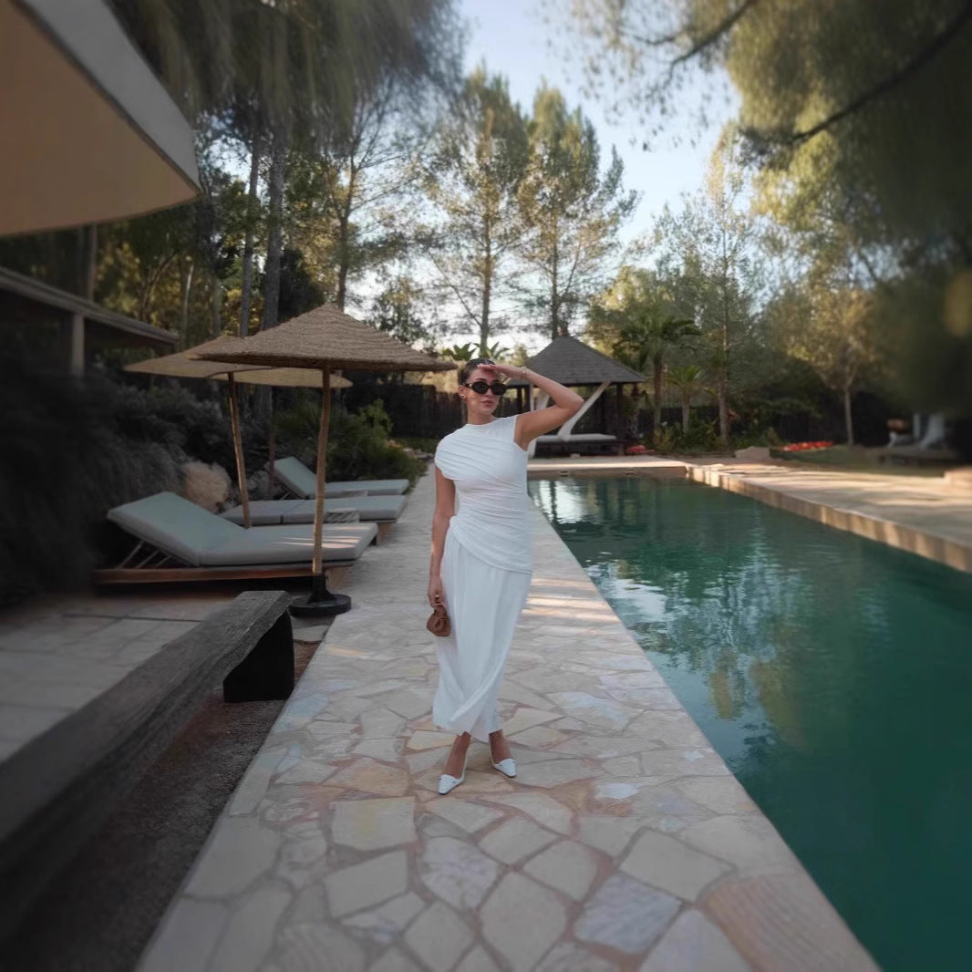 - Design: The flowing cut emphasizes the silhouette while the careful drapery adds a modern touch.