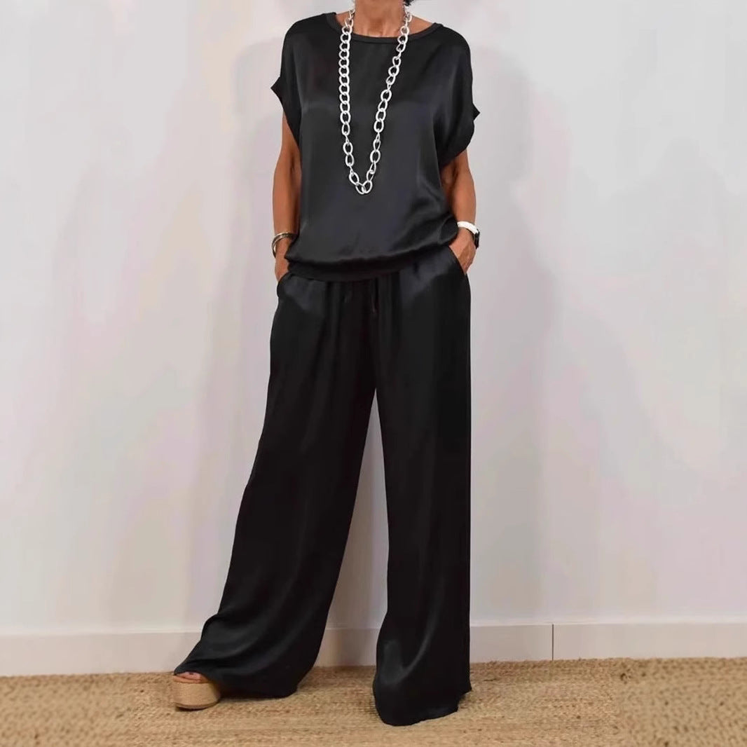 Discover the elegant satin lounge set from Ivyshape that combines comfort and style. This fashionable set consists of a casual top and wide-legged pants, perfect for relaxed days or special occasions.