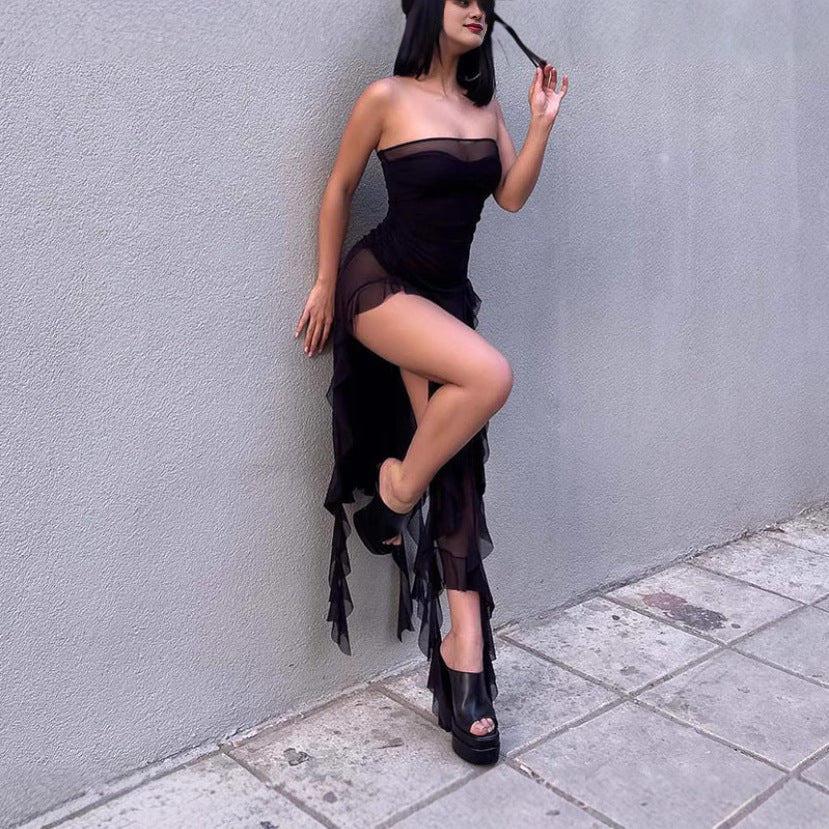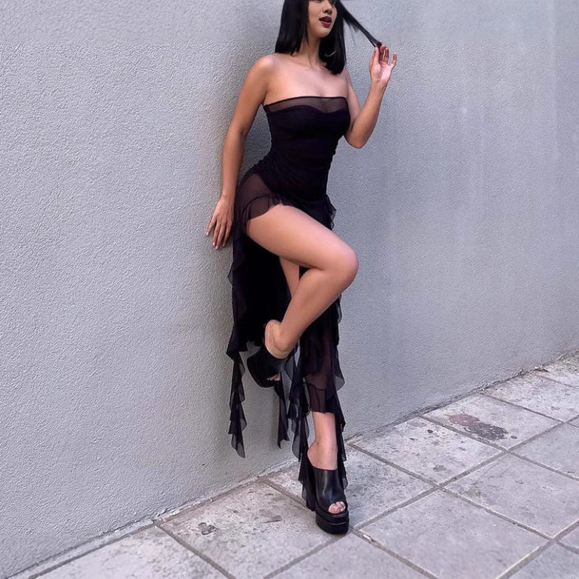 Discover the stunning women's Elegant Strapless Maxi Dress with transparent ruffles from Ivyshape, perfect for special occasions and summer parties. This dress combines elegance and comfort, ensuring you stand out in the spotlight.