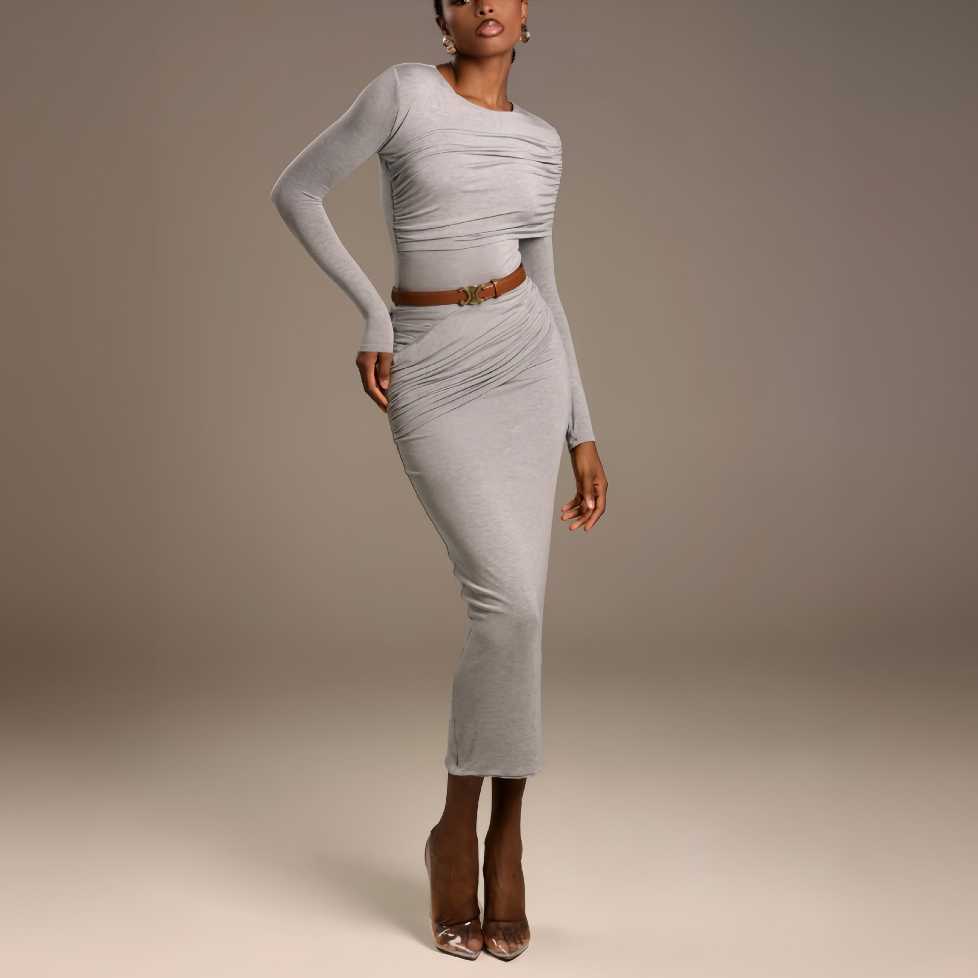 This women's wrap dress features an artful draping design that flatters your figure and exudes elegance. The fine fabric ensures a comfortable wear, and the long sleeves make it ideal for various seasons.