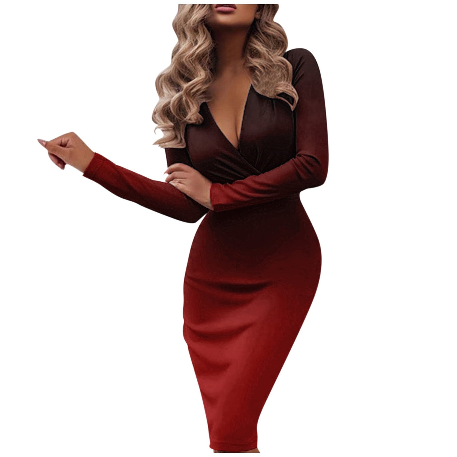 Women figure-hugging Cut-Out dress with deep V-neck and long sleeves Ivyshape