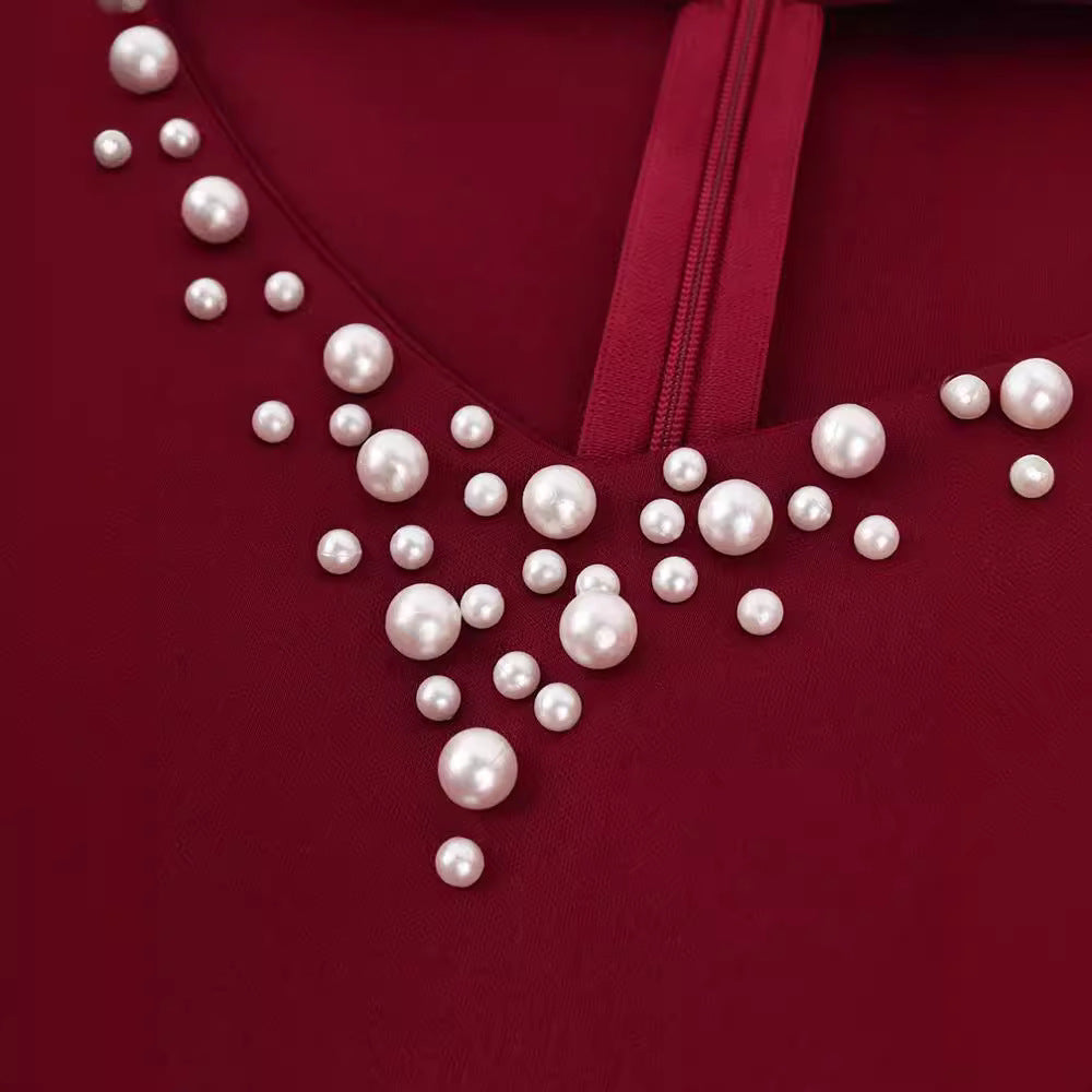 - Neckline: The chic V-neckline is adorned with sparkling accents that provide extra glamour.