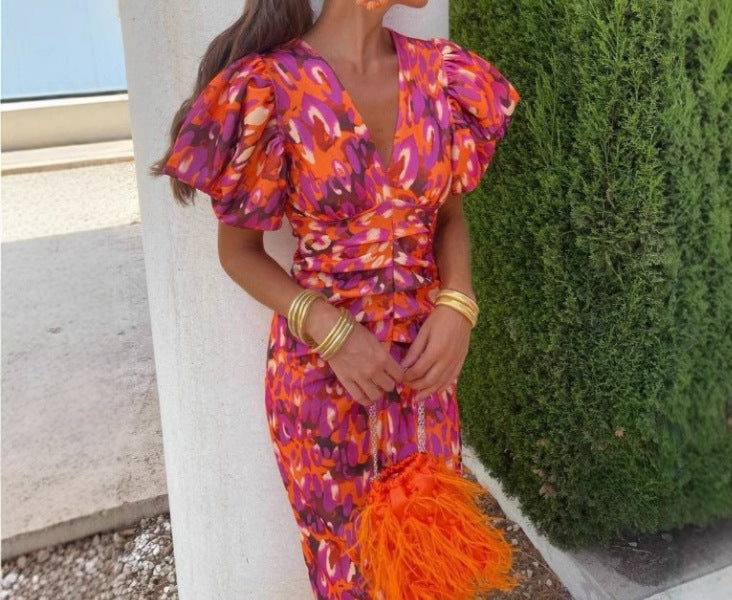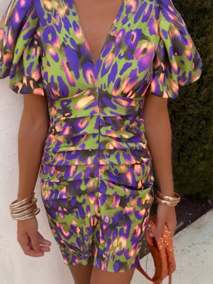 Women Figure-hugging Midnight Dress with Puff Sleeves and V-neck Ivyshape