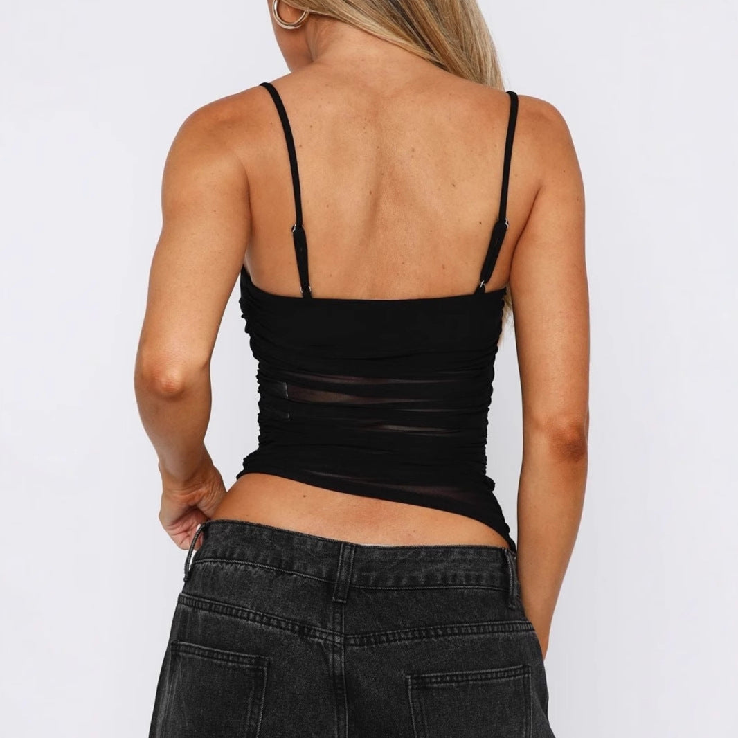 The women's fitted sheer top with ruching and thin straps from Ivyshape combines fashionable elegance with a touch of playfulness. This contemporary top is the perfect addition to your outfit and is versatile to style.