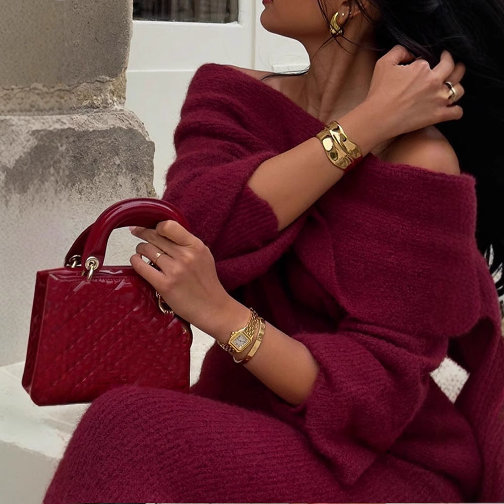 Women's Knit Maxi Dress with Off-Shoulder Neckline and Voluminous Sleeves Ivyshape