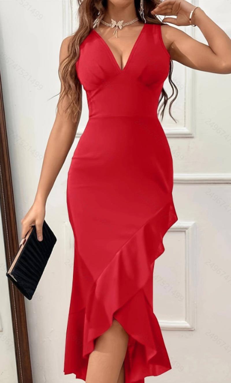 Discover our Women's Elegant Wrap Dress, featuring a deep V-neck and a playful ruffled hem. This dress is the perfect choice for special occasions or elegant evening events.