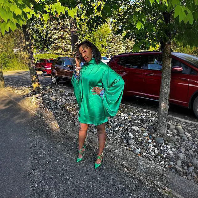 Our women's fashionable plus-size mini dress with voluminous sleeves and an elegant stand-up collar is the perfect companion for stylish occasions. This dress combines comfort and elegance, ensuring you shine in any situation.