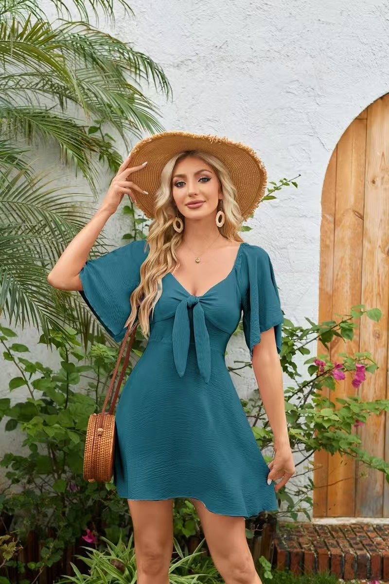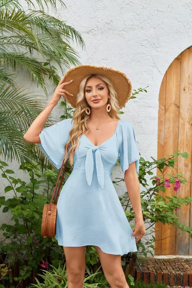 Discover the stylish women's mini dress with knot detail from Ivyshape, perfect for summer. This airy dress combines elegance and comfort, making it ideal for beach days or casual parties.